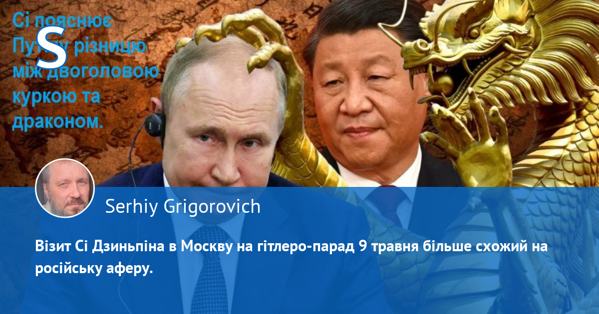 Немає ніякої серйозної причини Сі Дзіньпіну їхати у Москву в якій не все гаразд з бомбардуваннями, та ще і на святкування перемоги над Гітлером біля могили гітлерівського другана «Сталіна»-Джугашвілі, стояти поруч з послідовником Гітлера військовим злочинцем Путіним з клікухою «все за 3 дні чи за 3 тижні».