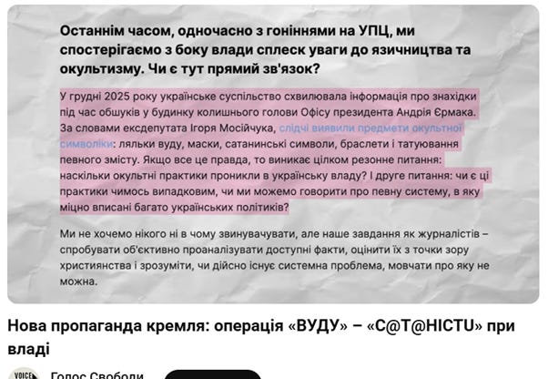 У писульці-горе статті пишуть про "ляльки вуду" у Єрмака, що країною нібито керують окультисти. Це не просто маразм, це технологія москальської пропаганди. НАБУ таких знахідок не підтверджує. Їхній "доказ" — цитата якого підозрюють у державній зраді Дубінського.