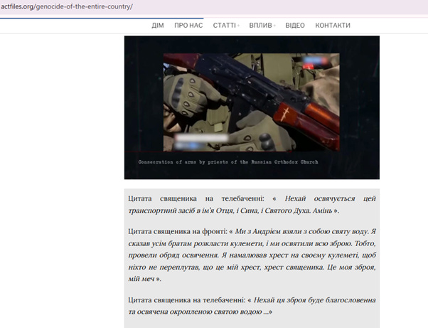 :ЦИТУЮ: "Освячується знаряддя це. "В ім'я Отця, Сина і Святого Духа. Амінь. Ми з собою взяли з Андрієм святу воду. І я сказав всім братам розкласти автомати. І ми освятили всю зброю. Тобто чин освячення провели. Я намалював на своєму автоматі хрест, щоб не плутали, що це