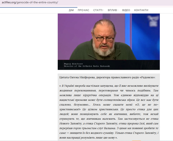 ЦИТУЮ те, що на скрині: "На Україні хвороба так запущена, що вже ніякими вмовляннями, переговорами, нічим там нічого це вилікувати неможливо. Там можлива тільки хірургія. Тому відповідь на ось ці виступи нацистів може бути тільки одна -сонцепьок. Це потрібно випалювати. Цілком так мені скажуть: "Ой, це не по-християнськи, по-християнськи цілком. Просто етика для цих людей. Вони ж самі себе позиціонують як язичники. Вибачте мене і отримайте як язичники. Тому для вас не новозавітна етика, а старозавітна". Ільї пророка,