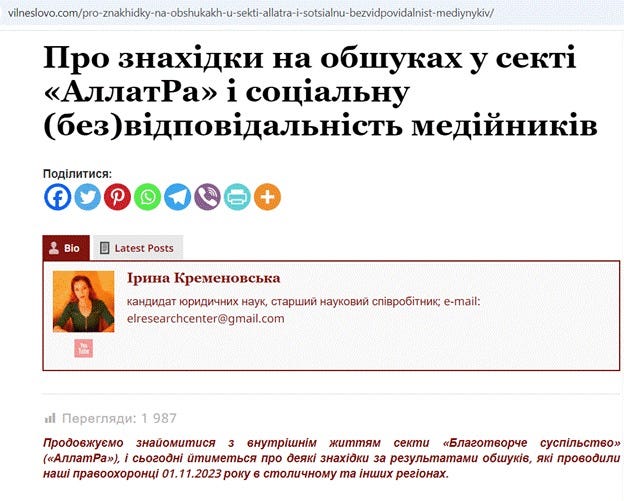 Слід зазначити, що численні та достовірні докази (наведені нижче) переконливо свідчать про те, що Ірина #Кременовська є активним учасником російського антикультового руху. Встановлено її систематичну та тісну співпрацю з #РАЦИРС (Російською асоціацією центрів вивчення релігій і сект) і з російськими представниками антикультового угруповання, діяльність якого характеризується відверто ворожою позицією щодо України, її суверенітету і територіальної цілісності, а також щодо країн Європейського Союзу і США.