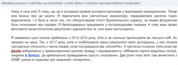 Під її авторством на порталі "ГОВОРИ!" (Вільне слово), де вона, порушуючи презумпцію невинуватості, грубо висловлює своє зневажливе, упереджене ставлення до Руху "АЛЛАТРА" в Україні і визнає, що є тією людиною, яка активно протягом 7 років лобіювала кримінальне переслідування його учасників в Україні, а потім ще складала експертні висновки і "обґрунтовувала статті кримінального кодексу", за якими оголошувалися підозри, що є неприпустимим втручанням у хід досудового розслідування. Зі статті також випливає, що перешкоджанню законній діяльності громадської організації передувала 5-річна "важка робота" позапроцесуальним способом правоохоронців НПУ та Департаменту захисту національної державності СБУ, в той час як офіційне розслідування на той момент тривало всього 1,5 року!