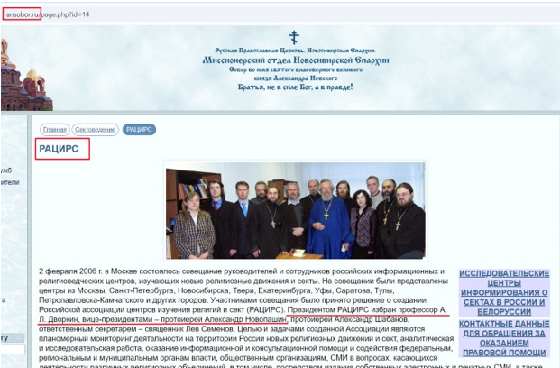 Публікація статті про спільну діяльність Ірини Кременовської та Олександра Невеєва на сайті РАЦИРС. Більше того, друга за значенням осередок РАЦІРС — Місіонерський відділ Новосибірської єпархії, очолюваний віце-президентом РАЦІРС Олександром Новопашиним ,