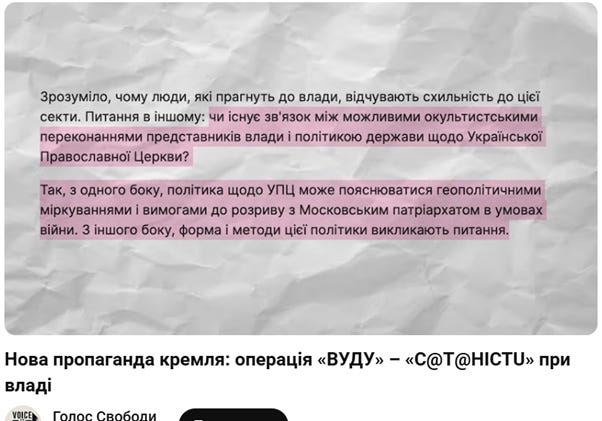 Цитую вам з горе- статті: «питання в іншому. Чи існує зв'язок між можливими окультистськими переконаннями представників влади і політикою держави щодо Української православної церкви? Так, з одного боку, політика щодо УПЦ може пояснюватися геополітичними міркуваннями і вимогами до розриву з Московським патріархатом в умовах війни. З іншого боку, форма і методи цієї політики викликають питання»