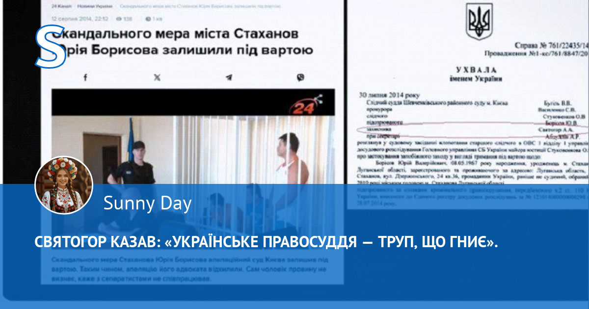 У 2014 Святогор захищав в якості адвоката мера Стаханова Юрія Борисова, якого звинувачували у сепаратизмі, порушенні територіальної цілісності України, проведенні незаконного референдуму по відокремленню областей та створенні ЛНР і ДНР. При цьому, як ми вже показували в минулому випуску, захищаючи сепаратиста та зрадника, він поливав всю Україну брудом. На фоні свого невинного, підзахисного, #Святогор казав, що українське правосуддя схоже на труп, що повільно гниє, а расія з Україною — дружні суверенні держави. Звинувачував у всьому український суд та наполягав на його некомпетентності.