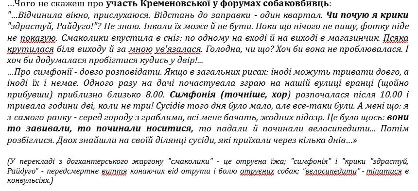 В цьому контексті стає зрозумілим, чому саме #Кременовська в Україні стала натхненною поплічницею Дворкіна та агенткою його структури РАЦИРС, афілійованої з ФСБ. Адже вона так само отримувала задоволення від тривалих страждань безневинних собак, яких вона особисто пригощала «смаколиками» (тобто отрутою) на вулицях міст. А собаки це перший крок. Далі ті, хто отримує задоволення від смерті тварин, зазвичай переходять на людей.