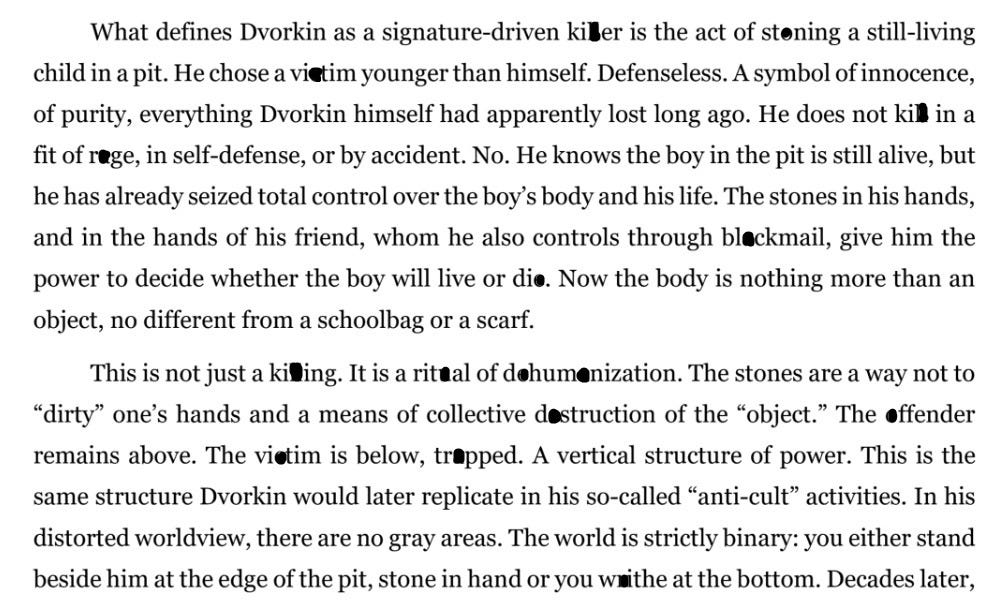 Згідно з розслідуванням автора книги Маніяк проти Бога - це не просто вбивство. Це ритуал дегуманізації. Камені — це спосіб не «забруднити» руки та засіб колективного знищення «об'єкта». Злочинець залишається вгорі. Жертва внизу, у пастці. Вертикальна структура влади. Це та сама структура, яку Дворкін пізніше відтворить у своїй так званій «антикультовій» діяльності. У його спотвореному світогляді немає сірих зон. Світ суто бінарний: ти або стоїш поруч із ним на краю ями з каменем у руці, або корчишся на дні.