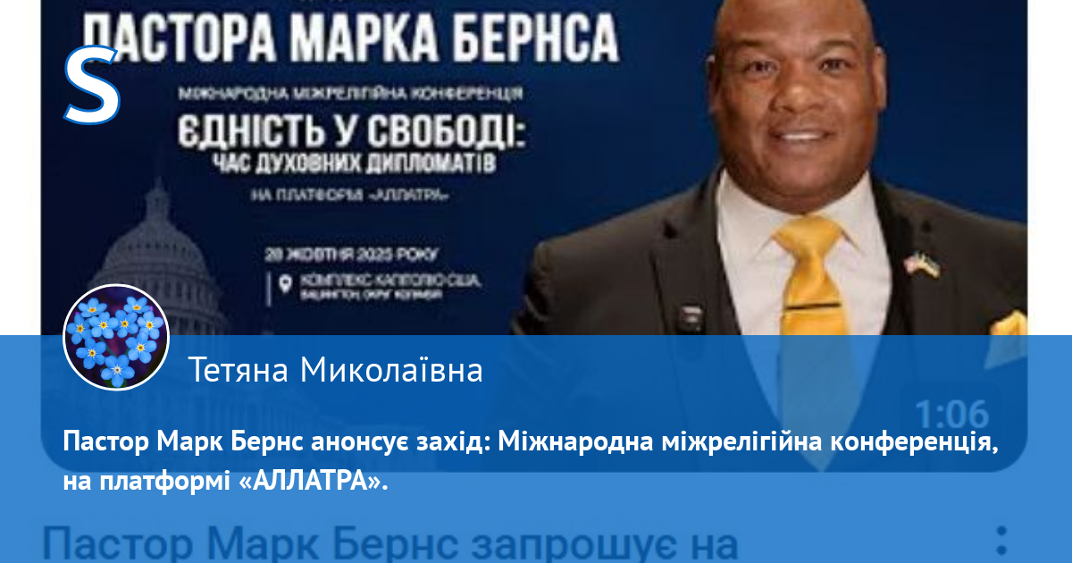 Пастор Марк Бернс оголошує про майбутню Міжнародну міжрелігійну конференцію «Єдність у свободі: час духовних дипломатів„ (United in Liberty: The Rise of Spiritual Diplomats), яка відбудеться на платформі «АЛЛАТРА„. Ця знакова подія об«єднає видатних духовних лідерів і лідерів глобальних змін з метою зміцнення діалогу, просування миру і утвердження прихильності цінностям, які об„єднують людство, незважаючи на відмінності.
