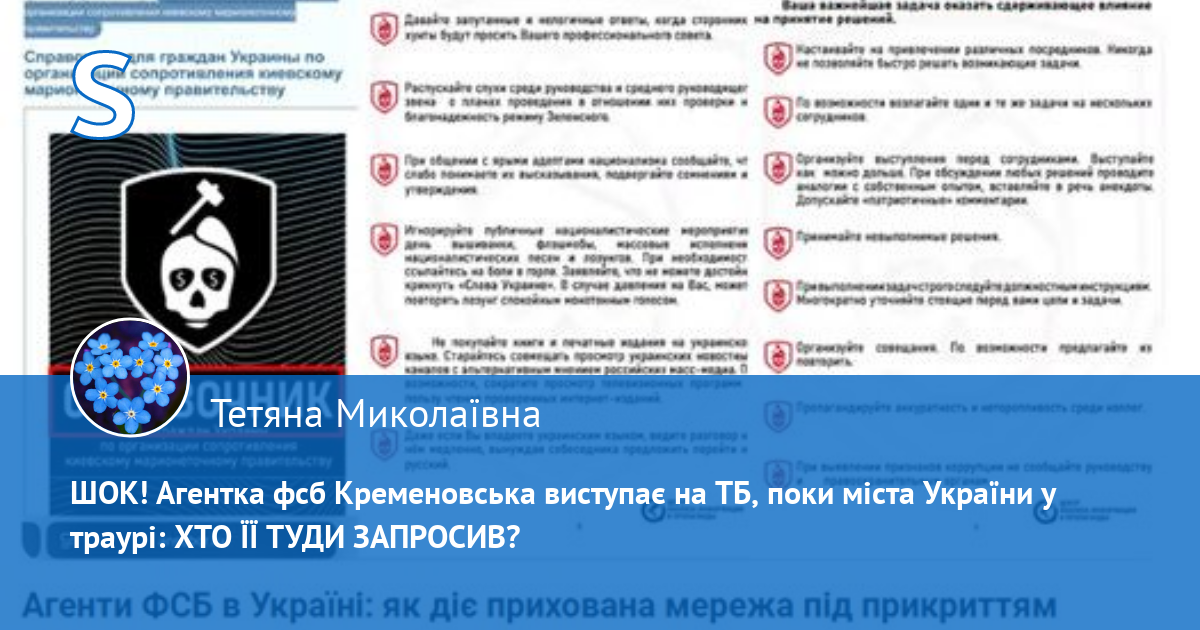ШОК! Поки міста України у траурі від ракетних ударів, на екранах українських телеканалів з'являється Ірина #Кременовська – особа, яка, за даними, є відкритою агенткою фсб. Її виступи, де вона з'являється як «експерт» , – це не що інше, як методична робота за вказівками російських кураторів, спрямована на руйнування України зсередини.