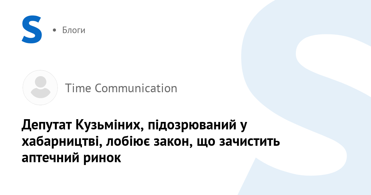 Народний депутат Сергій Кузьміних, якого у 2022 році НАБУ затримало на хабарі у 558 тисяч гривень, продовжує впливати на державну політику у сфері фармацевтики. Попри відсутність профільної освіти, він очолює підкомітет з питань фармації Комітету Верховної Ради з питань здоров'я нації. У публічному просторі депутат просуває ідеї, які суттєво змінюють конфігурацію ринку лікарських засобів.