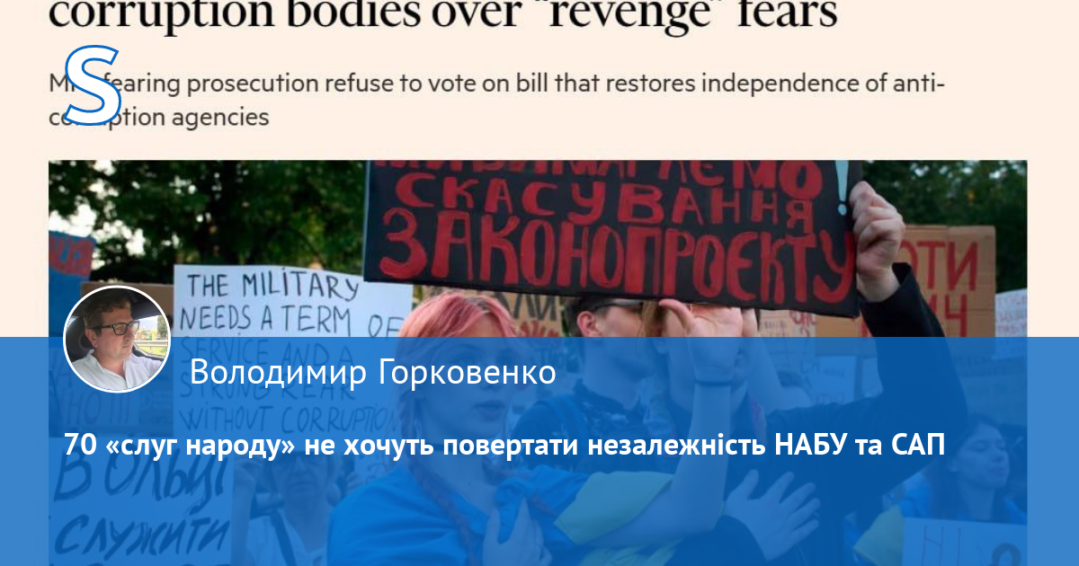 Депутати Зеленського відмовляються відновлювати антикорупційні органи через побоювання «помсти», — Financial Times