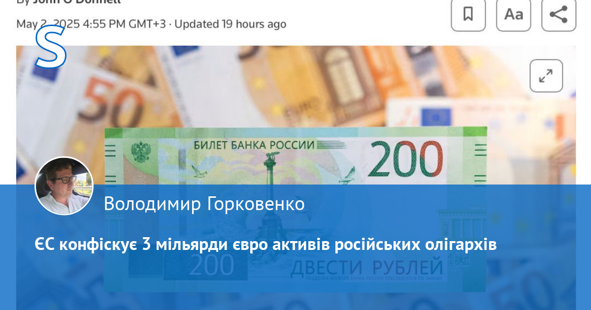 Європейський Союз готується конфіскувати близько 3 мільярдів євро заморожених активів російських компаній і наближених до кремля осіб, — повідомляє – Reuters.
