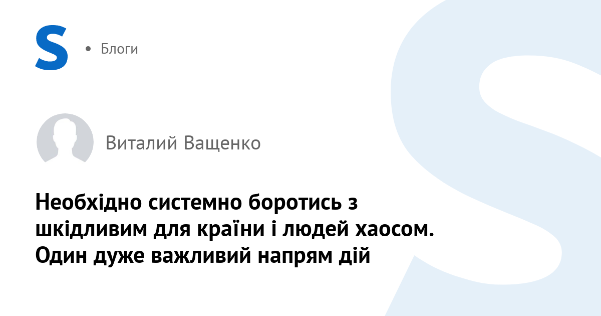 Хаос в нас многогранний — має багато складових і вкрай шкідливий. Не можна сказати, що з ним зовсім ніхто не бореться і не боровся. Але системно не боролися. А хаос, в наших умовах, загрожує цілісності і навіть існуванню нашої держави. Також хаос є головною причиною виїзду Українців на Захід з неповерненням і можливої демографічної катастрофи. Хаос не дає країні розвиватись і всебічно зміцнюватись.
