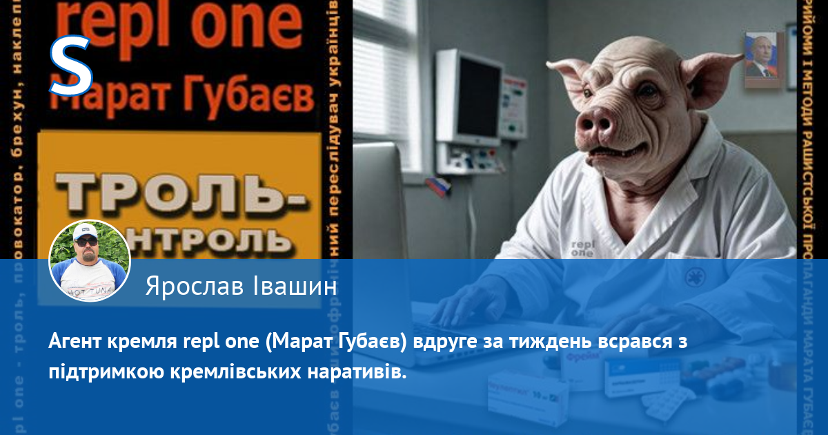 Путінська мразь в особі татарського ублюдка — свинопса Марата Ернстовича Губаєва (мешканця м. Харків, пр. Ак. Курчатова 28, кв. 69.), який ПЕРЕСЛІДУЄ українців у мережі під анонімною агентурною кличкою repl one, і який ПЕРШИМ (!) (зверніть увагу на час публікацій) розводить і провокує срач, шляхом цинічних наклепів, у яких переплюнув рашистських пропагандистів, зробив ще одну невдалу спробу захистити рашистські наративи шляхом брехні, ніби план з 28-ми пунктів співпадає з європейськими пропозиціями з 19-ти пунктів. Губаєв, вміло і лицемірно маніпулюючи смертями жертв війни, визнає, що він свинопес, бо його аватарка на одному з багатьох анонімних профілів, де він так само гадив українцям, саме так підписана: