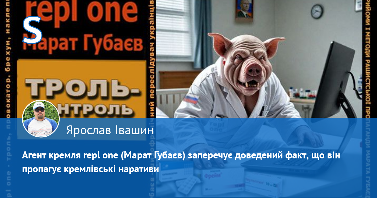 Переслідуючи мене за те, що я писав, аби у плані путлєра, який зараз часто називають планом Трампа, були передбачені інтереси України, а не лише рашки, агент кремля Марат Ернстович Губаєв (м. Харків, пр. Ак. Курчатова 28, кв. 69.), тут і далі пропагандонить під анонімною агентурною кличкою repl one, де під приховом антиросійської і пронатовської риторики на цьому сайті займається провокаціями, брехнею, наклепами, сіянням міжетнічної і міжконфесійної ворожнечі, дискредитацією ЗСУ і головнокомандуючого, дискредитацією Конституції України і національних символів українців і переслідуваннями своїх опонентів.