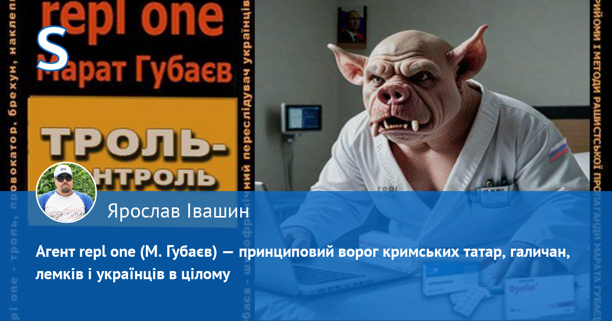 За антиросійською і пронатовською риторикою аноніма "repl one" ховається шизофренічний кремлівський брехливий свинопес - маніпулятор кримсько-татарського походження Марат Ернестович Губаєв (м. Харків, пр. Ак. Курчатова 28, кв. 69.), який ПЕРЕСЛІДУЄ українців у мережі. Він ПЕРШИМ (!) (зверніть увагу на час публікацій) розводить і провокує срач, шляхом цинічних наклепів, у яких переплюнув рашистських пропагандистів. Він визнає, що він свинопес, бо його аватарка на одному з багатьох анонімних профілів, де він гадив українцям, саме так підписана: