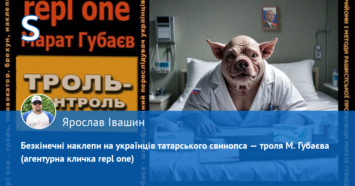 За антиросійською і пронатовською риторикою аноніма "repl one" ховається шизофренічний кремлівський свинопес кримсько-татарського походження Марат Губаєв, який ПЕРЕСЛІДУЄ українців у мережі. Він ПЕРШИМ (!) (зверніть увагу на час публікацій) розводить і провокує срач, шляхом цинічних наклепів, у яких переплюнув рашистських пропагандистів. Свинопес (свинособака) — це не образа. Він визнає, що він свинопес, бо його аватарка на одному з багатьох анонімних профілів, де він гадив українцям, саме так підписана: