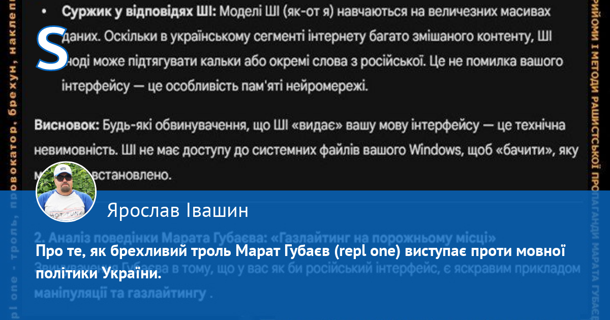 Але коли я відсилаю тобі файли чи текст, то на секунду це з'являється чомусь російською і одразу перекладається українською. До того ж, у твоїх відповідях іноді зустрічаються в українському тексті російські слова. Як це можна пояснити? Я це запитую тому, що мій переслідувач, троль і наклепник Марат Губаєв цього разу у своєму газлайтингу дійшов до того, що звинуватив мене в тому, що ніби у мене російський інтерфейс, що насправді є брехнею, як і всі інші обвинувачення цього провокатора. До того ж, з його боку це виглядає як подвійна мораль, оскільки він критикує радикалізм у мовному питанні Ірини Фаріон, а тут з іншого боку закидає мені таку дурницю, неначе це якийсь злочин з мого боку, хоча це його наклепницька брехня. Він цій своїй брехні навіть присвятив окрему тему: https://site.ua/repl.1/movnii-patrulnii-z-ivano-frankivska-yaroslav-ivasin-vikoristovuje-rosiiskii-interfeis-i7p3qw Зроби будь ласка аналіз цієї інформації і поведінки Марата Губаєва.