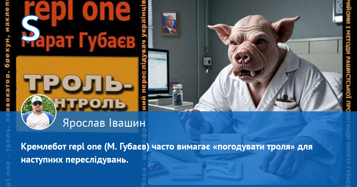 Зверніть увагу на тексти користувача під ніком repl2 з міста «Харьків» (sic!), який на r2u зовсім недавно — з 3 січня 2021. Усе чисто за методичкою з-за «порєбріка». З'явився щойно, ховається за ніком. У назві міста «випадкова» помилка. Спочатку робить якийсь нейтральний коментар, щоб зав'язати діалог. Далі — обов'язкове посилання на шовіністичний допис, який рясніє антиукраїнською пропагандою. Ну, і стандартний набір псевдопатріотичних заклинань: згадки комуністів і «запорєбріка» всує, претензії на месіанство, звинувачення опонента у «недостатньому» чи «неправильному» патріотизмі тощо — хоча, як це у них прийнято, вихідних текстів так і не прочитав. Хтось досі думає, що це не троль на «запорєбрікових» дотаціях, а наш довірливий і заблуклий у правописних міфологемах хлоп? Тоді зайдіть на російські платформи, де пропонують заробіток в інтернеті коментарями. Можливо, щось і прозріється... Авжеж, тролю важко. Потрібно вдавати з себе патріота, а ненависть до всього українського так і яріє звідусіль... Думаю, що до риторики подібних псевдопатріотів потрібно виробити імунітет. То починаймо вже. P. S. Щойно повідомили, що за ніком repl2 ховається «міський навіжений» Марат Губаєв. Що ж, країна повинна знати своїх героїв. 28.01.2021. P.P.S. На жаль, спрацювало правило «хто не встиг — той спізнився». Адміністратори вже знищили всю тролеву творчість.