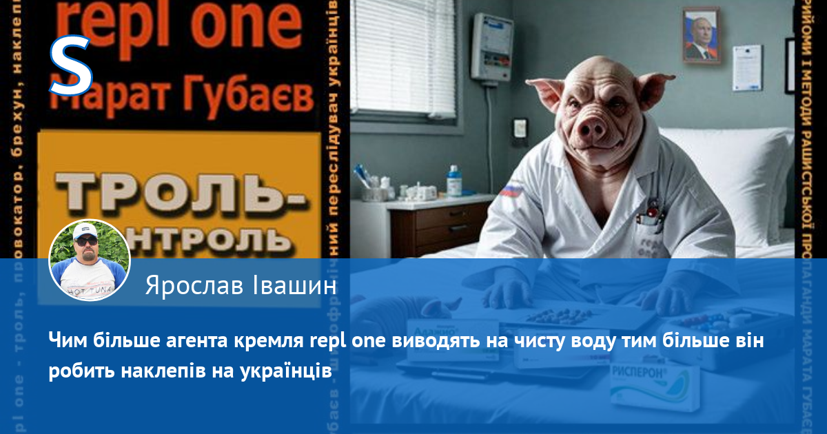 За антиросійською і пронатовською риторикою аноніма "repl one" ховається шизофренічний кремлівський свинопес кримсько-татарського походження Марат Губаєв, який ПЕРЕСЛІДУЄ українців у мережі. Він ПЕРШИМ (!) (зверніть увагу на час публікацій) розводить і провокує срач, шляхом цинічних наклепів, у яких переплюнув рашистських пропагандистів. Свинопес (свинособака) — це не образа. Він визнає, що він свинопес, бо його аватарка на одному з багатьох анонімних профілів, де він гадив українцям, саме так підписана: