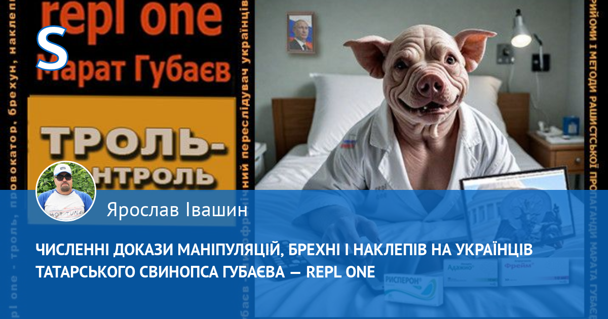 За антиросійською і пронатовською риторикою аноніма "repl one" ховається шизофренічний кремлівський брехливий свинопес - маніпулятор кримсько-татарського походження Марат Губаєв, який ПЕРЕСЛІДУЄ українців у мережі. Він ПЕРШИМ (!) (зверніть увагу на час публікацій) розводить і провокує срач, шляхом цинічних наклепів, у яких переплюнув рашистських пропагандистів. Він визнає, що він свинопес, бо його аватарка на одному з багатьох анонімних профілів, де він гадив українцям, саме так підписана: