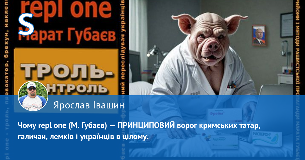 За антиросійською і пронатовською риторикою аноніма "repl one" ховається шизофренічний кремлівський брехливий свинопес - маніпулятор кримсько-татарського походження Марат Ернестович Губаєв (м. Харків, пр. Ак. Курчатова 28, кв. 69.), який ПЕРЕСЛІДУЄ українців у мережі. Він ПЕРШИМ (!) (зверніть увагу на час публікацій) розводить і провокує срач, шляхом цинічних наклепів, у яких переплюнув рашистських пропагандистів. Він визнає, що він свинопес, бо його аватарка на одному з багатьох анонімних профілів, де він гадив українцям, саме так підписана: