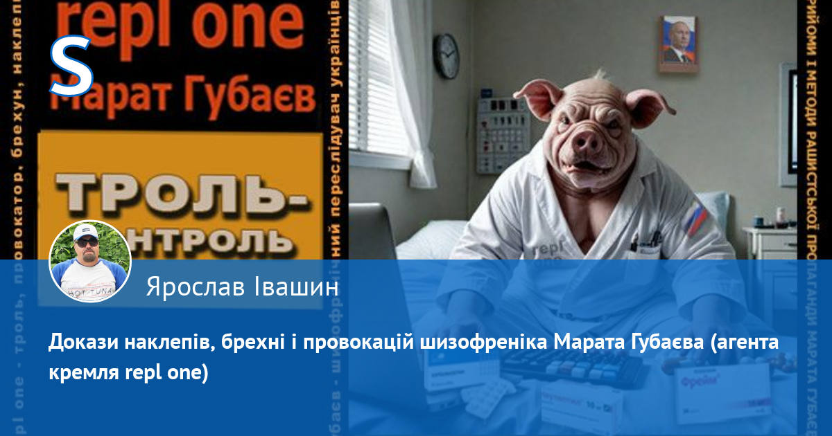 Переслідуючи мене за те, що я писав, аби у плані путлєра, який зараз часто називають планом Трампа, були передбачені інтереси України, а не лише рашки, агент кремля Губаєв тут і далі пропагандонить під анонімною агентурною кличкою repl one, де під приховом антиросійської і пронатовської риторики на цьому сайті займається провокаціями, брехнею, наклепами, сіянням міжетнічної і міжконфесійної ворожнечі, дискредитацією ЗСУ і головнокомандуючого, дискредитацією Конституції України і національних символів українців і переслідуваннями своїх опонентів.