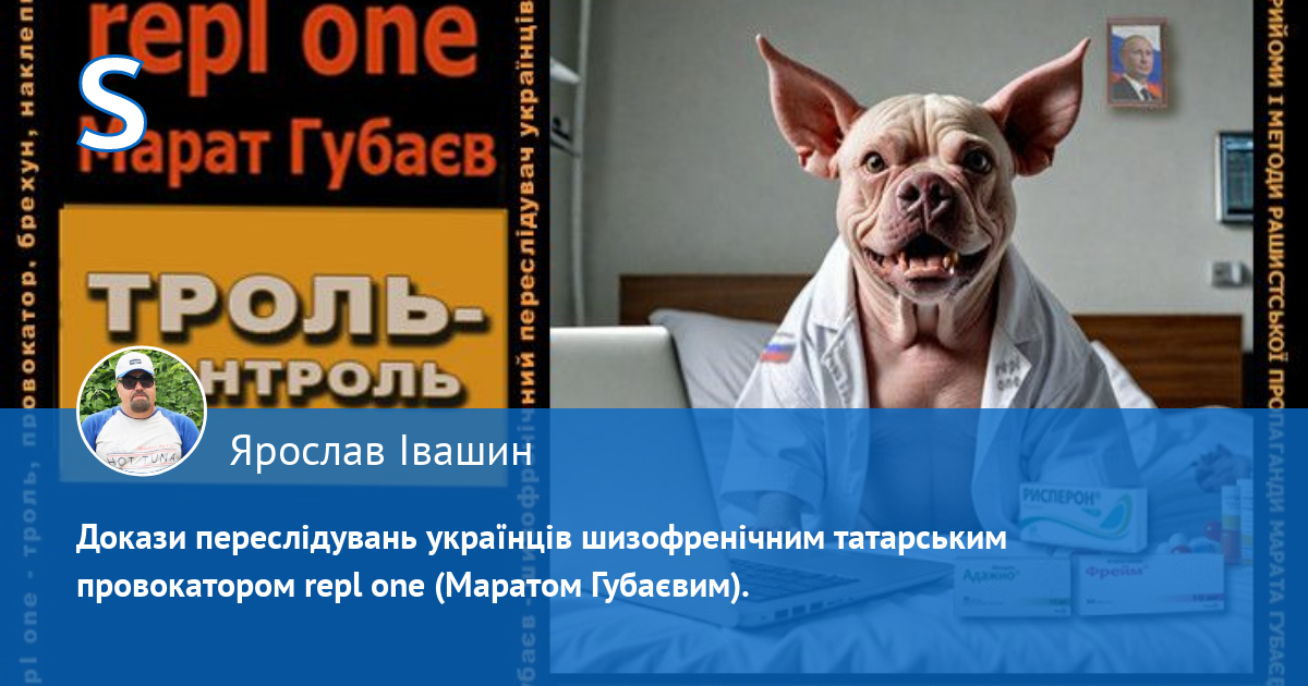 Татарський провокатор Марат Губаєв, який ховається за агентурною кличкою repl one, являється шизофренічним тролем і переслідувачем українців, і зараз це наочно буде доведено. Він від імені своїх численних анонімних клонів гадив українцям на різних сайтах і переслідував своїх опонентів, оскільки не може жити без провокацій, срачу і наклепів. Тому про себе він кругом залишив типову характеристику як душевнохворого троля який навіть доведені компромати на його адресу виставляв для власного піару, наприклад: (дивіться це посилання).