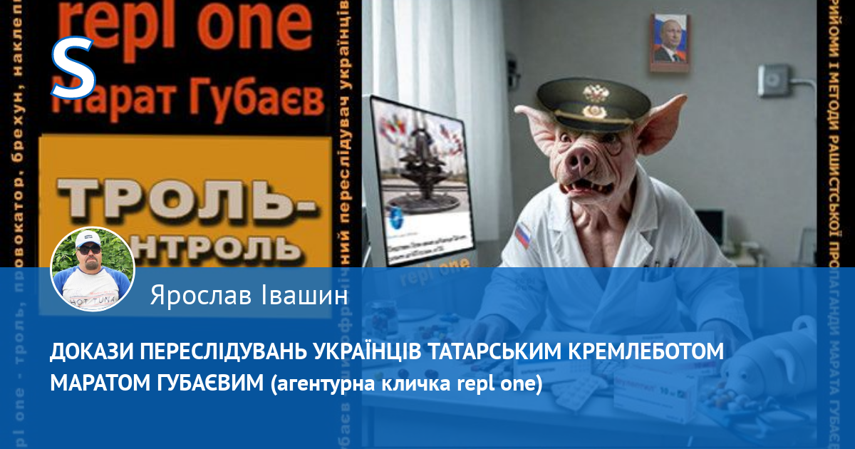 Татарський провокатор Марат Губаєв, який ховається за агентурною кличкою repl one, являється шизофренічним тролем і переслідувачем українців, і зараз це наочно буде доведено. Він від імені своїх численних анонімних клонів гадив українцям на різних сайтах і переслідував своїх опонентів, оскільки не може жити без провокацій, срачу і наклепів. Тому про себе він кругом залишив типову характеристику як душевнохворого троля який навіть доведені компромати на його адресу виставляв для власного піару, наприклад: (дивіться це посилання).