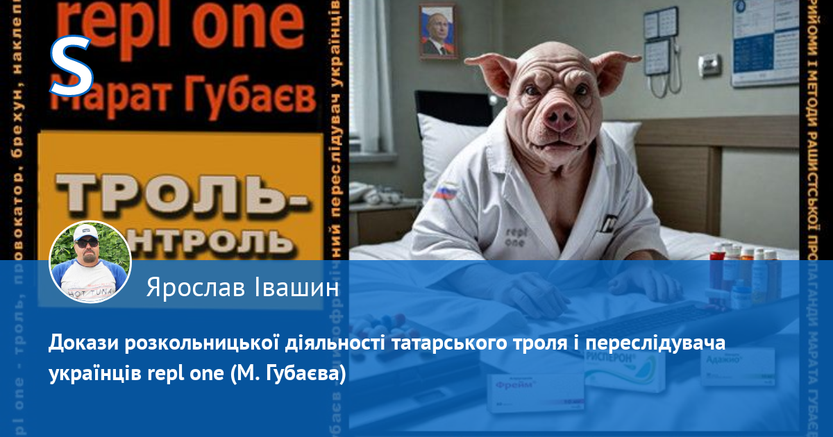 За антиросійською і пронатовською риторикою аноніма "repl one" ховається шизофренічний кремлівський брехливий свинопес - маніпулятор кримсько-татарського походження Марат Губаєв, який ПЕРЕСЛІДУЄ українців у мережі. Він ПЕРШИМ (!) (зверніть увагу на час публікацій) розводить і провокує срач, шляхом цинічних наклепів, у яких переплюнув рашистських пропагандистів. Свинопес (свинособака) — це не образа. Він визнає, що він свинопес, бо його аватарка на одному з багатьох анонімних профілів, де він гадив українцям, саме так підписана: