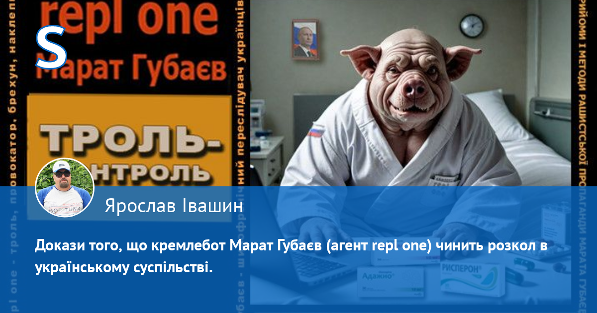 За антиросійською і пронатовською риторикою аноніма "repl one" ховається шизофренічний кремлівський свинопес кримсько-татарського походження Марат Губаєв, який ПЕРЕСЛІДУЄ українців у мережі. Він ПЕРШИМ (!) (зверніть увагу на час публікацій) розводить і провокує срач, шляхом цинічних наклепів, у яких переплюнув рашистських пропагандистів. Свинопес (свинособака) — це не образа. Він визнає, що він свинопес, бо його аватарка на одному з багатьох анонімних профілів, де він гадив українцям, саме так підписана: