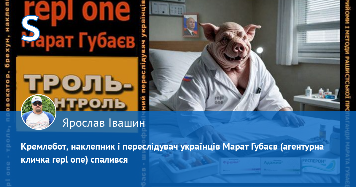 За антиросійською і пронатовською риторикою аноніма "repl one" ховається шизофренічний кремлівський свинопес кримсько-татарського походження Марат Губаєв, який ПЕРЕСЛІДУЄ українців у мережі. Він ПЕРШИМ (!) (зверніть увагу на час публікацій) розводить і провокує срач, шляхом цинічних наклепів, у яких переплюнув рашистських пропагандистів.  Свинопес (свинособака) — це не образа. Він визнає, що він свинопес, бо його аватарка на одному з багатьох анонімних  профілів, де він гадив українцям, саме так підписана: