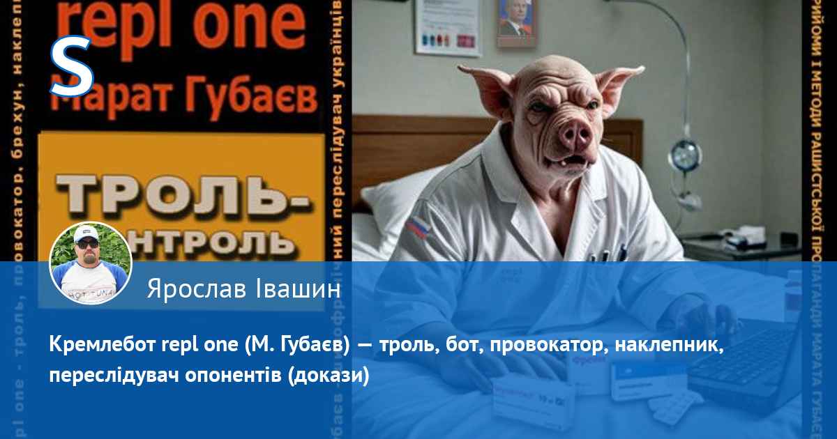 Татарський провокатор Марат Губаєв, який ховається за агентурною кличкою repl one, являється шизофренічним тролем і переслідувачем українців, і зараз це наочно буде доведено. Він від імені своїх численних анонімних клонів гадив українцям на різних сайтах і переслідував своїх опонентів, оскільки не може жити без провокацій, срачу і наклепів. Тому про себе він кругом залишив типову характеристику як душевнохворого троля який навіть доведені компромати на його адресу виставляв для власного піару, наприклад: (дивіться це посилання).
