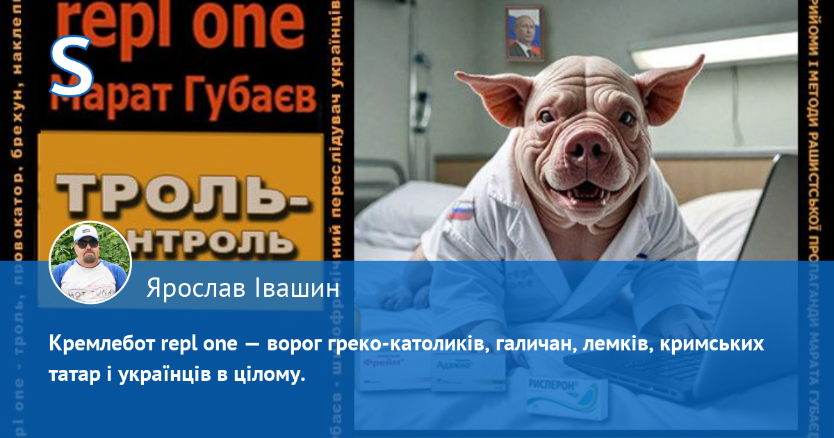 За антиросійською і пронатовською риторикою аноніма "repl one" ховається шизофренічний кремлівський брехливий свинопес - маніпулятор кримсько-татарського походження Марат Губаєв, який ПЕРЕСЛІДУЄ українців у мережі. Він ПЕРШИМ (!) (зверніть увагу на час публікацій) розводить і провокує срач, шляхом цинічних наклепів, у яких переплюнув рашистських пропагандистів. Він визнає, що він свинопес, бо його аватарка на одному з багатьох анонімних профілів, де він гадив українцям, саме так підписана: