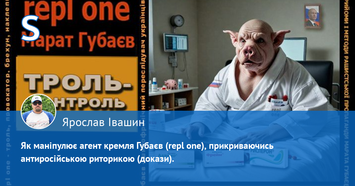 За антиросійською і пронатовською риторикою аноніма "repl one" ховається шизофренічний кремлівський брехливий свинопес - маніпулятор кримсько-татарського походження Марат Губаєв, який ПЕРЕСЛІДУЄ українців у мережі. Він ПЕРШИМ (!) (зверніть увагу на час публікацій) розводить і провокує срач, шляхом цинічних наклепів, у яких переплюнув рашистських пропагандистів. Свинопес (свинособака) — це не образа. Він визнає, що він свинопес, бо його аватарка на одному з багатьох анонімних профілів, де він гадив українцям, саме так підписана: