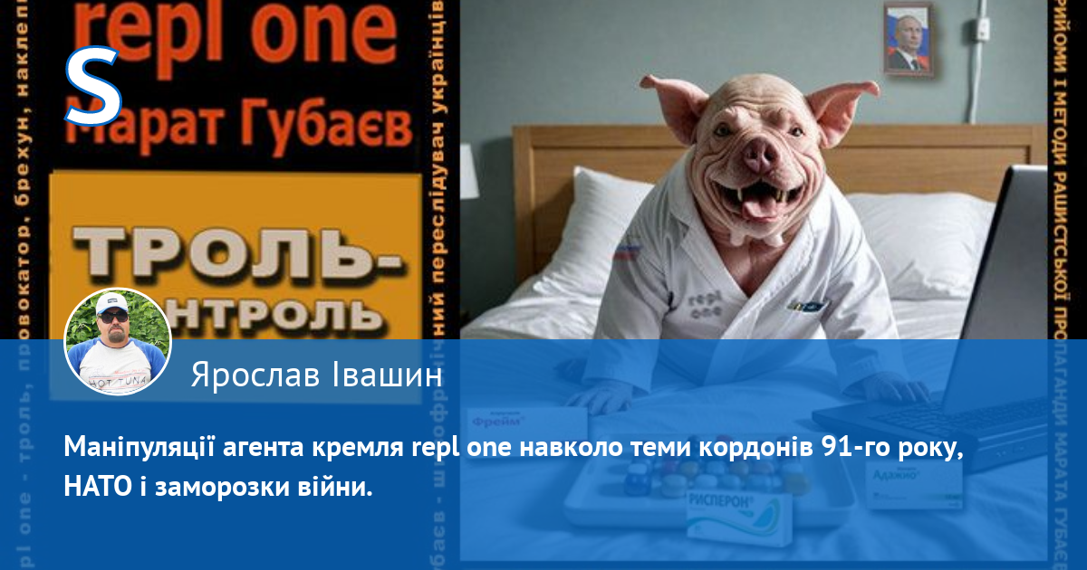 За антиросійською і пронатовською риторикою аноніма "repl one" ховається шизофренічний кремлівський брехливий свинопес - маніпулятор кримсько-татарського походження Марат Губаєв, який ПЕРЕСЛІДУЄ українців у мережі. Він ПЕРШИМ (!) (зверніть увагу на час публікацій) розводить і провокує срач, шляхом цинічних наклепів, у яких переплюнув рашистських пропагандистів. Він визнає, що він свинопес, бо його аватарка на одному з багатьох анонімних профілів, де він гадив українцям, саме так підписана: