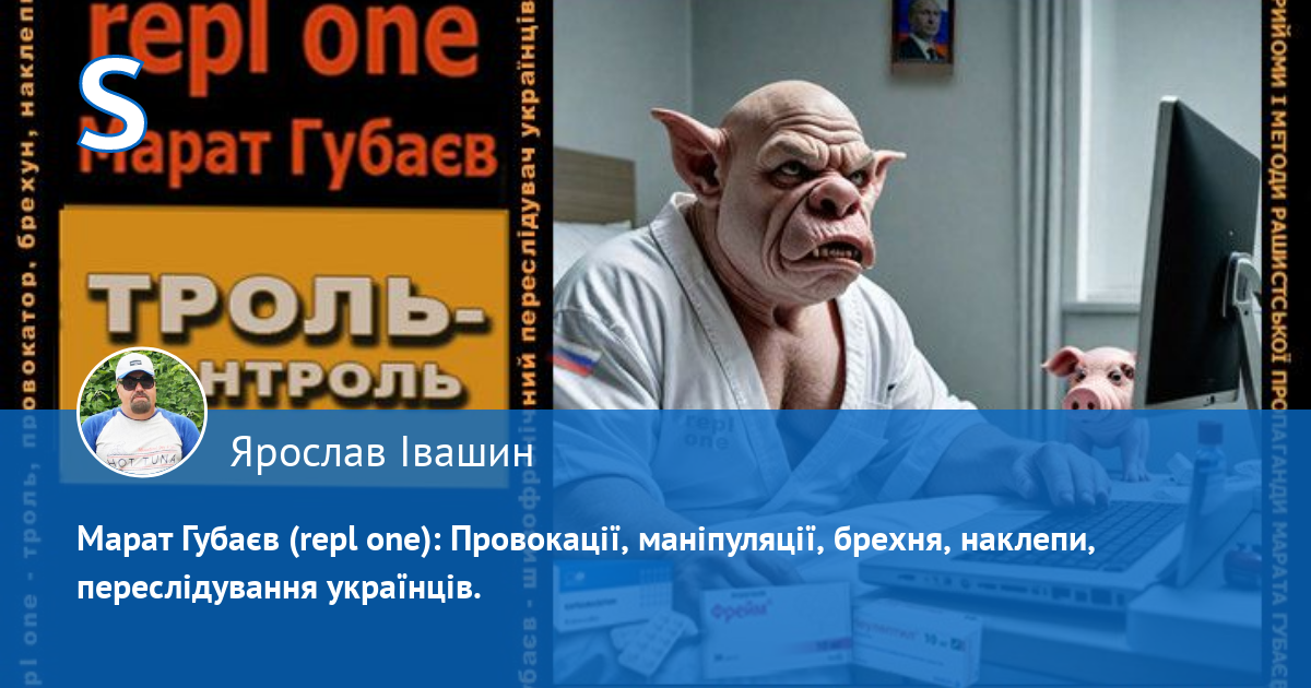 Переслідуючи мене за те, що я писав, аби у плані путлєра, який зараз часто називають планом Трампа, були передбачені інтереси України, а не лише рашки, агент кремля Губаєв тут і далі пропагандонить під анонімною агентурною кличкою repl one, де під приховом антиросійської і пронатовської риторики на цьому сайті займається провокаціями, брехнею, наклепами, сіянням міжетнічної і міжконфесійної ворожнечі, дискредитацією ЗСУ і головнокомандуючого, дискредитацією Конституції України і національних символів українців і переслідуваннями своїх опонентів.