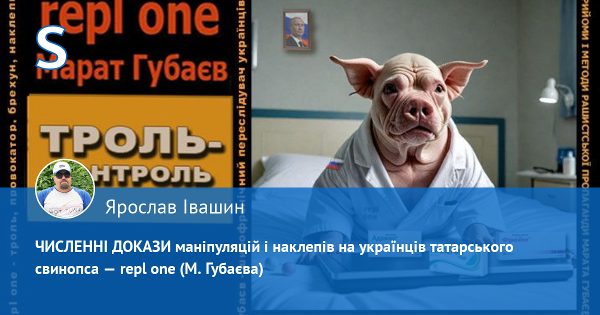 За антиросійською і пронатовською риторикою аноніма "repl one" ховається шизофренічний кремлівський брехливий свинопес -  маніпулятор кримсько-татарського походження Марат Губаєв, який ПЕРЕСЛІДУЄ українців у мережі. Він ПЕРШИМ (!) (зверніть увагу на час публікацій) розводить і провокує срач, шляхом цинічних наклепів, у яких переплюнув рашистських пропагандистів.  Свинопес (свинособака) — це не образа. Він визнає, що він свинопес, бо його аватарка на одному з багатьох анонімних  профілів, де він гадив українцям, саме так підписана: