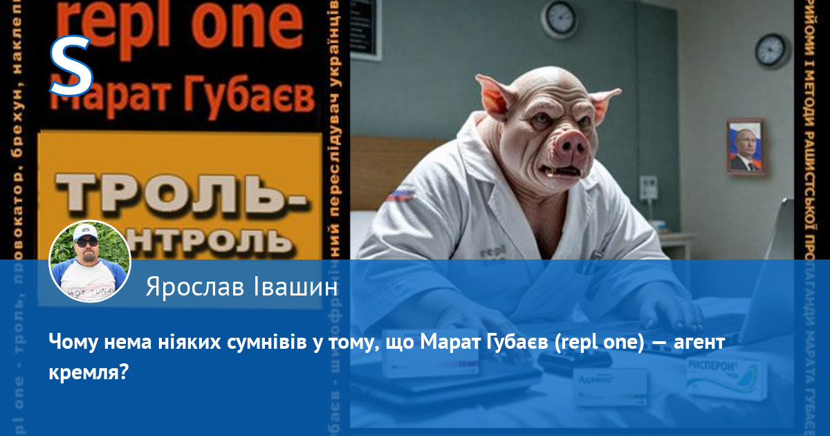 За антиросійською і пронатовською риторикою аноніма 'repl one' ховається шизофренічний кремлівський брехливий свинопес -  маніпулятор кримсько-татарського походження Марат Губаєв, який ПЕРЕСЛІДУЄ українців у мережі. Він ПЕРШИМ (!) (зверніть увагу на час публікацій) розводить і провокує срач, шляхом цинічних наклепів, у яких переплюнув рашистських пропагандистів. Він визнає, що він свинопес, бо його аватарка на одному з багатьох анонімних  профілів, де він гадив українцям, саме так підписана: