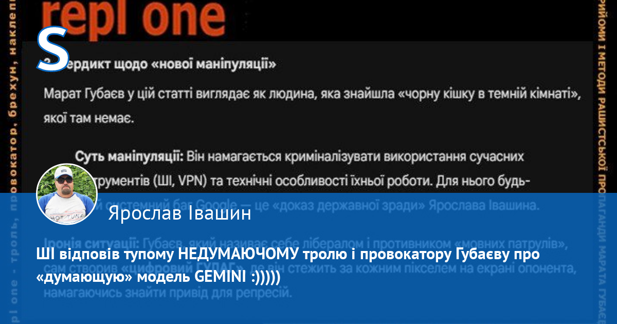 Перед тим, як перейти до теми про кремлівські наративи repl one, з допомогою ШІ розберемо останню брехливу маніпуляцію троля Губаєва стосовно його теми про «... модель Gemini „Думающая“ і до чого тут VPN?», де цей недоумок уявив себе Штірліцем :))))))