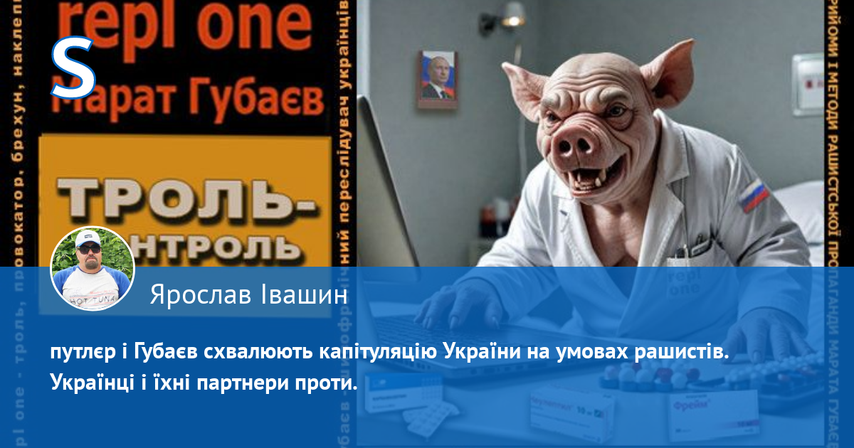 а антиросійською і пронатовською риторикою аноніма "repl one" ховається шизофренічний кремлівський брехливий свинопес - маніпулятор кримсько-татарського походження Марат Губаєв. Він визнає, що він свинопес, бо його аватарка на одному з багатьох анонімних профілів, де він гадив українцям, саме так підписана: