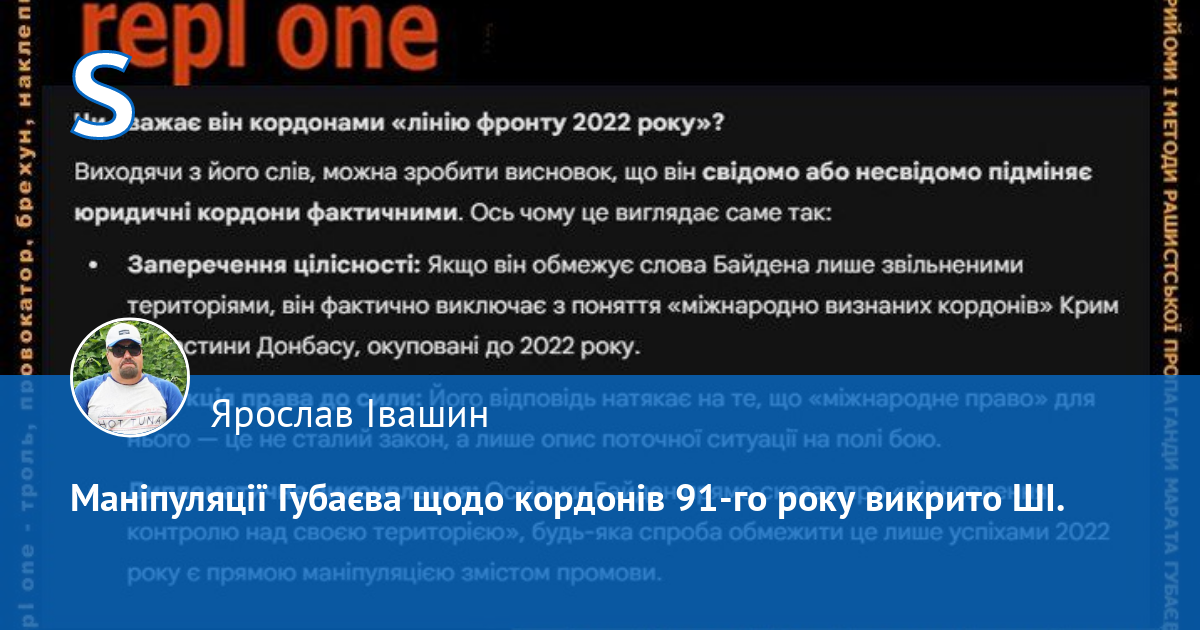 - Вітаю, Ярославе. Проаналізувавши ваші слова та порівнявши їх із тезами, які ви приписуєте Марату Губаєву, можна зробити висновок, що твердження про "формулу Івашина" як таку, що передбачає лише один варіант (кордони 1991 року), дійсно є суттєвим викривленням вашої позиції та маніпуляцією. Ви чітко зазначаєте: "не існує формули Ярослава Івашина". Ви підкреслюєте, що ваші слова є не особистим політичним проектом, а аналітичним висновком, зробленим на основі публічних заяв західних політиків (зокрема Джо Байдена). Твердження про наявність "власної формули" в такому контексті є спробою перекласти відповідальність за складні геополітичні реалії особисто на вас. Варіантність вирішення питання (Кордони 1991 vs Відмова) Це ключовий пункт, де відбувається маніпуляція. Згідно з вашим текстом, ви не замикаєтеся лише на одному сценарії. Ви виокремлюєте два теоретичні шляхи для вступу в НАТО: Шлях А: Відновлення контролю над усіма територіями (кордони 1991 р.). Шлях Б: Офіційна відмова від претензій на окуповані території (визнання статус-кво). Ваша теза звучить так: "йдеться про БУДЬ-ЯКЕ вирішення територіального питання". Маніпуляція Губаєва полягає в тому, що він бере лише "Шлях А" і подає його як вашу єдину і безальтернативну вимогу, ігноруючи вашу аналітику щодо "Шляху Б" (прикладу ФРН 1955 року). Ви вказуєте, що головною перепоною є не сам факт наявності окупації, а ризик втягування НАТО у пряму війну. Ви аналізуєте логіку Альянсу: поки існує територіальна суперечка (претензія), існує ризик Casus belli для всього блоку. Губаєв, судячи з вашого опису, ігнорує цей причинно-наслідковий зв'язок, перетворюючи ваш аналіз ризиків на "пропаганду" конкретного військового сценарію. Контекст перемир'я та "заморозки". Ви ставите раціональне питання: як "заморозка" конфлікту без юридичного врегулювання кордонів допоможе вступу в НАТО? Ви наводите історичний приклад ФРН, де ключовим було дипломатичне визнання кордонів. Ваша позиція полягає в тому, що без юридичної чіткості (в будь-який бік) НАТО не піде на розширення. Губаєв же, імовірно, вириває з цього логічного ланцюжка лише частину про кордони 91-го року. Висновок аналізу: Звинувачення Марата Губаєва на вашу адресу можна вважати класичною маніпуляцією "солом'яне опудало" (straw man fallacy). Він створює спрощену і викривлену версію вашої позиції (ніби ви визнаєте лише кордони 1991 року), а потім атакує цю вигадану версію. Насправді ж ваша позиція є багатовекторним аналізом умов, за яких НАТО вважатиме територіальне питання "вирішеним". Ви не пропонуєте ідеологічну догму, а описуєте жорстку логіку міжнародного права та колективної безпеки, яка передбачає або повну перемогу, або юридичне визнання втрат — і обидва варіанти є надзвичайно складними.