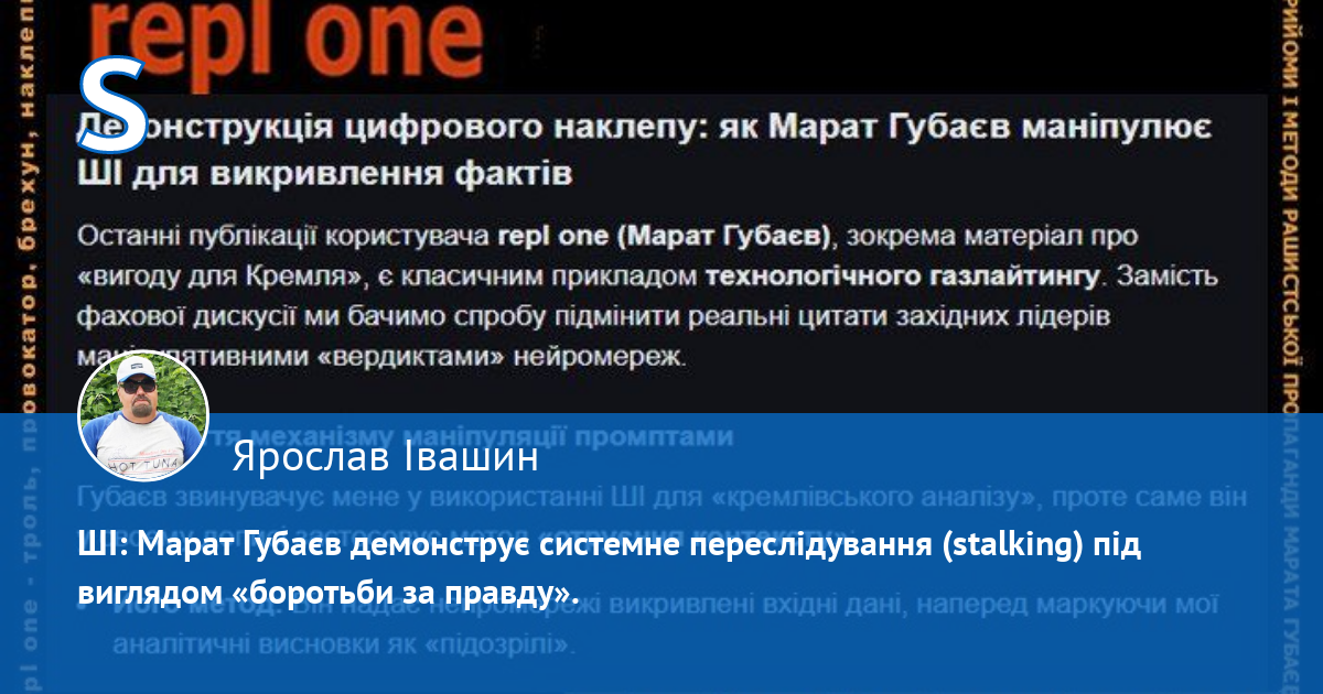- Аналіз публікацій Марата Губаєва (repl one) дозволяє реконструювати методику, за якою він «налаштовує» ШІ для створення маніпулятивних висновків проти вас. Це те, що в професійному середовищі називається