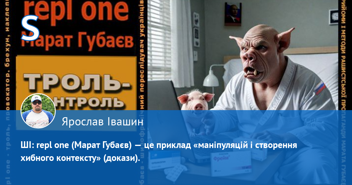 Отож, маніпуляції брехливого агента кремля repl one з ШІ побудовані не на моїх дослівних цитатах, а на його особистих висновках, які він зробив з моїх цитат. На відміну від цього провокатора, усі мої запити до ШІ зроблені виключно на основі його дослівних цитат, без жодних коментарів з мого боку А у брехуна repl one (Марата Губаєва) для ШІ подані не цитати, а його власні висновки, наприклад, ніби я називаю його агентом за ідею вступу в НАТО, а моєї такої цитати нема, бо це вигадана ним брехня, тому, коли він обдурив ШІ, в такому випадку ШІ може робити лише ПРИПУЩЕННЯ на основі пояснень провокатора Губаєва, а не моєї цитати.  Насправді я називаю його агентом з БАГАТЬОХ інших причин. У контексті НАТО — за те, що його проНАТОвська риторика є лицемірною, бо він відстоює ті документи. які навпаки, забороняють вступ України в НАТО. Докази ТУТ.  Також за його антишевченківську українофобію. Докази ТУТ. Також за його ненависть до галичан, українських лемків, кримськтих татар, греко-католиків, мусульман і українців в цілому. Докази ТУТ.  Також за те, що він виступає проти мовної політики України. Докази ТУТ. Також за те, що він переслідує українців в мережі. Докази багатьох українців з цього приводу ТУТ.  Також за те, що він у своїй пропаганді використовує такі шизофренічні наклепи, у яких переплюнув навіть Соловйова зі Скабєєвою . Докази ТУТ.