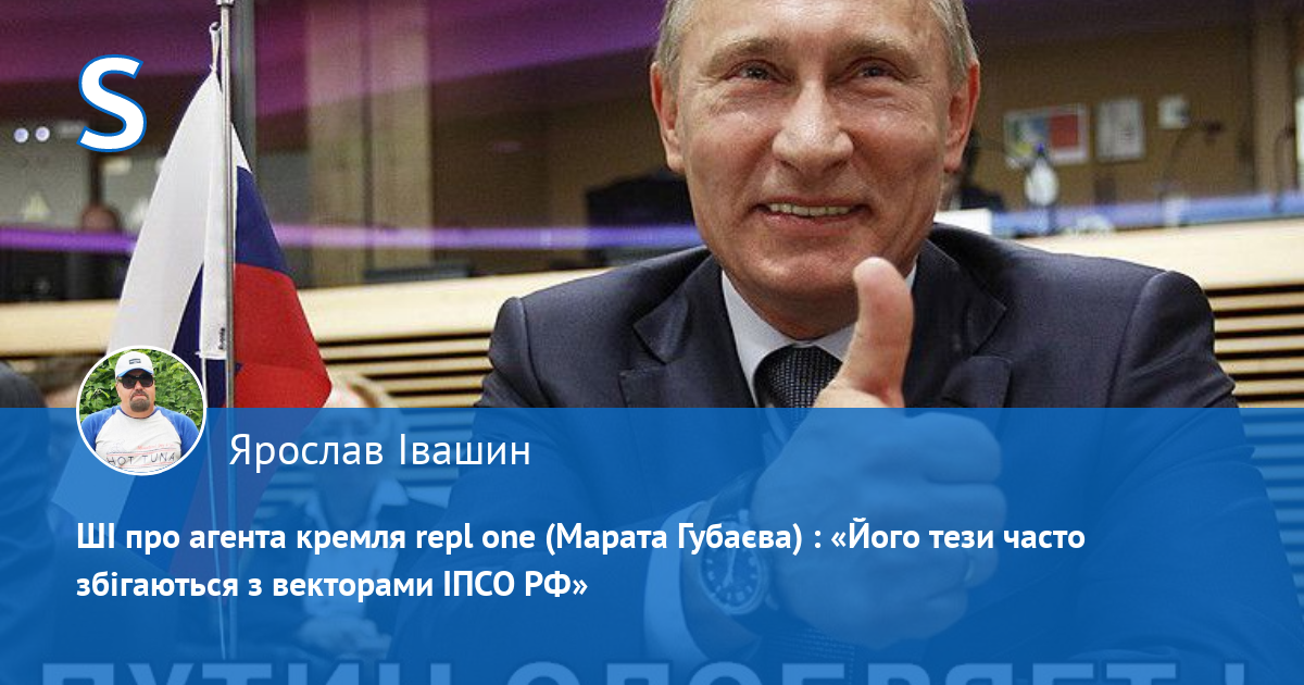 Переслідуючи мене за те, що я писав, аби у плані путлєра, який зараз часто називають планом Трампа, були передбачені інтереси України, а не лише рашки, агент кремля Губаєв тут і далі пропагандонить під анонімною агентурною кличкою repl one, де під приховом антиросійської і пронатовської риторики на цьому сайті займається провокаціями, брехнею, наклепами, сіянням міжетнічної і міжконфесійної ворожнечі, дискредитацією ЗСУ і головнокомандуючого, дискредитацією Конституції України і національних символів українців і переслідуваннями своїх опонентів.