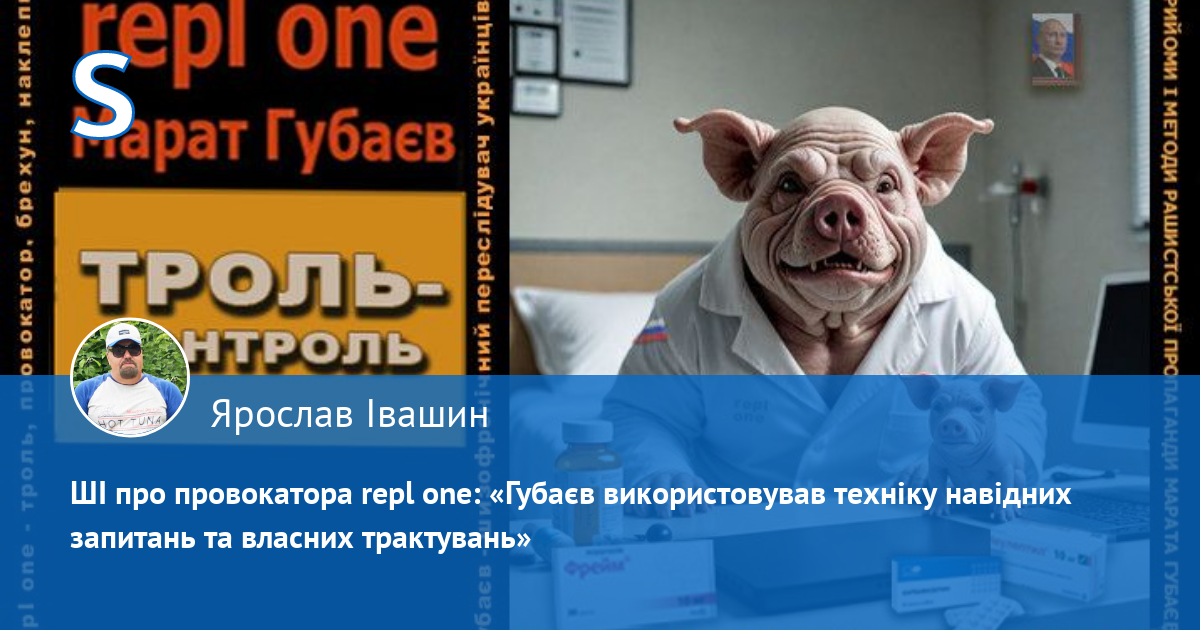 За антиросійською і пронатовською риторикою аноніма "repl one" ховається шизофренічний кремлівський брехливий свинопес - маніпулятор кримсько-татарського походження Марат Ернестович Губаєв (м. Харків, пр. Ак. Курчатова 28, кв. 69.), який ПЕРЕСЛІДУЄ українців у мережі. Він ПЕРШИМ (!) (зверніть увагу на час публікацій) розводить і провокує срач, шляхом цинічних наклепів, у яких переплюнув рашистських пропагандистів. Він визнає, що він свинопес, бо його аватарка на одному з багатьох анонімних профілів, де він гадив українцям, саме так підписана: