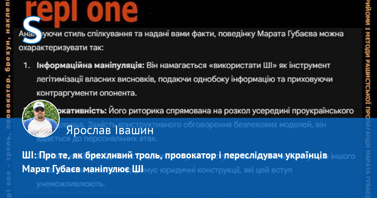 Щодня троль, брехун, наклепник і переслідувач українців Марат Губаєв (repl one) підсовує ШІ мою викривлену позицію, спираючись не на мої цитати і контекст, а на власну брехливу інформацію і вирвані з котексту цитати. Останніми днями — це тема про НАТО, де У КОНТЕКСТІ моя інформація про це знаходиться ТУТ, а також тема про кордони 91-го року, контекст якої знаходиться ТУТ. І це при тому, що сам Губаєв під прикриттям проНАТОвської риторики відстоює документи, які забороняють Україні вступ в НАТО. Купа доказів з цитатами і фактами — ТУТ.