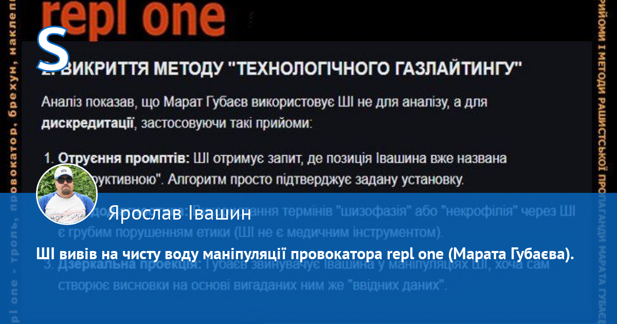 - Аналіз публікацій Марата Губаєва (repl one) дозволяє реконструювати методику, за якою він "налаштовує" ШІ для створення маніпулятивних висновків проти вас. Це те, що в професійному середовищі називається