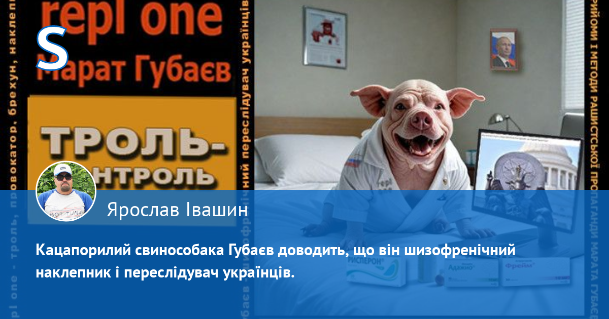 За антиросійською і пронатовською риторикою аноніма "repl one" ховається шизофренічний кремлівський брехливий свинопес - маніпулятор кримсько-татарського походження Марат Губаєв, який ПЕРЕСЛІДУЄ українців у мережі. Він ПЕРШИМ (!) (зверніть увагу на час публікацій) розводить і провокує срач, шляхом цинічних наклепів, у яких переплюнув рашистських пропагандистів. Він визнає, що він свинопес, бо його аватарка на одному з багатьох анонімних профілів, де він гадив українцям, саме так підписана: