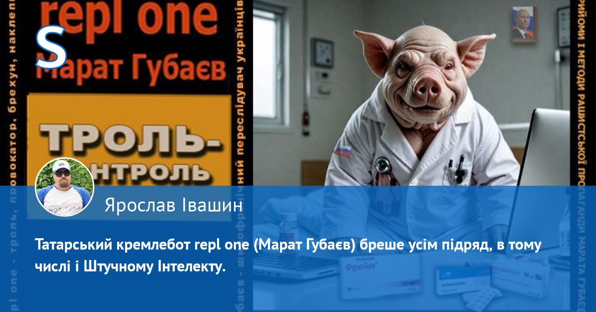За антиросійською і пронатовською риторикою аноніма "repl one" ховається шизофренічний кремлівський брехливий свинопес - маніпулятор кримсько-татарського походження Марат Ернестович Губаєв (м. Харків, пр. Ак. Курчатова 28, кв. 69.), який ПЕРЕСЛІДУЄ українців у мережі. Він ПЕРШИМ (!) (зверніть увагу на час публікацій) розводить і провокує срач, шляхом цинічних наклепів, у яких переплюнув рашистських пропагандистів. Він визнає, що він свинопес, бо його аватарка на одному з багатьох анонімних профілів, де він гадив українцям, саме так підписана: